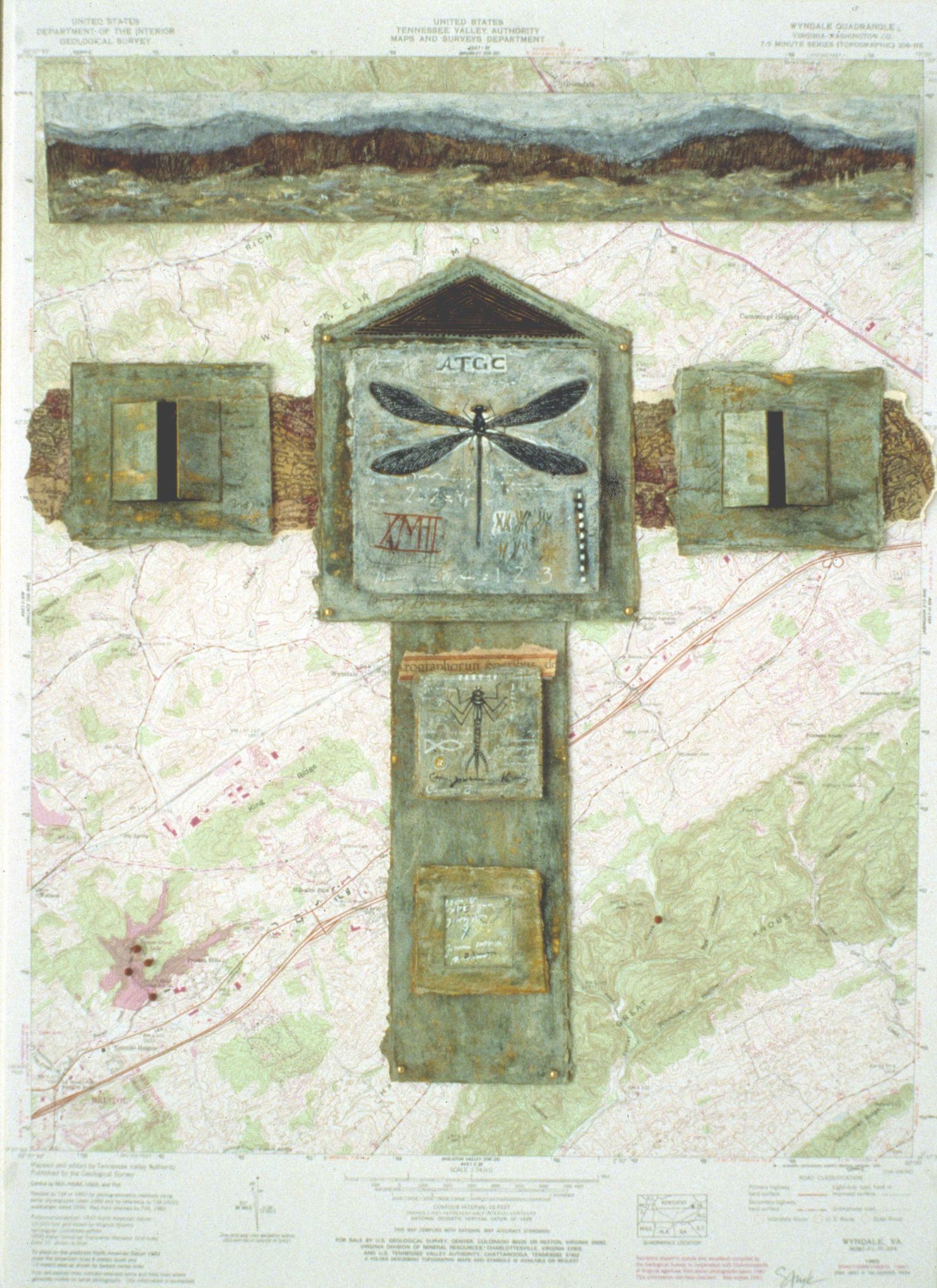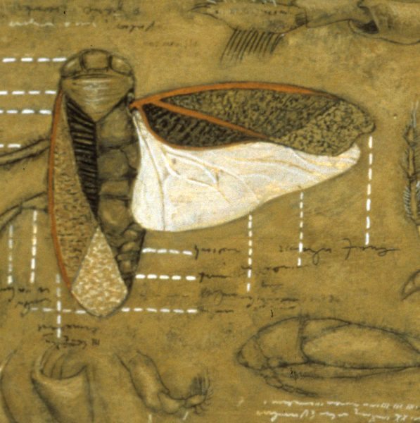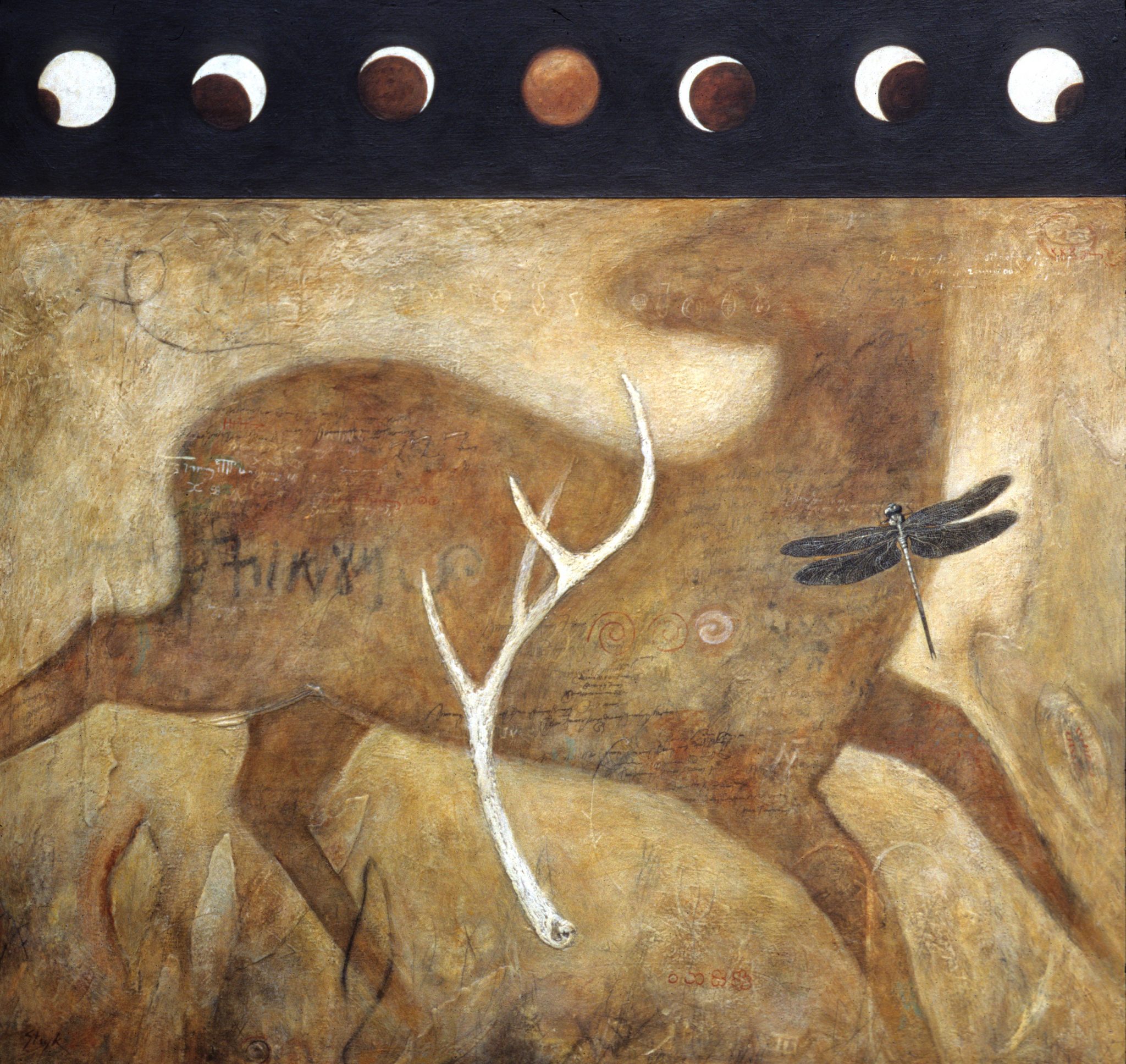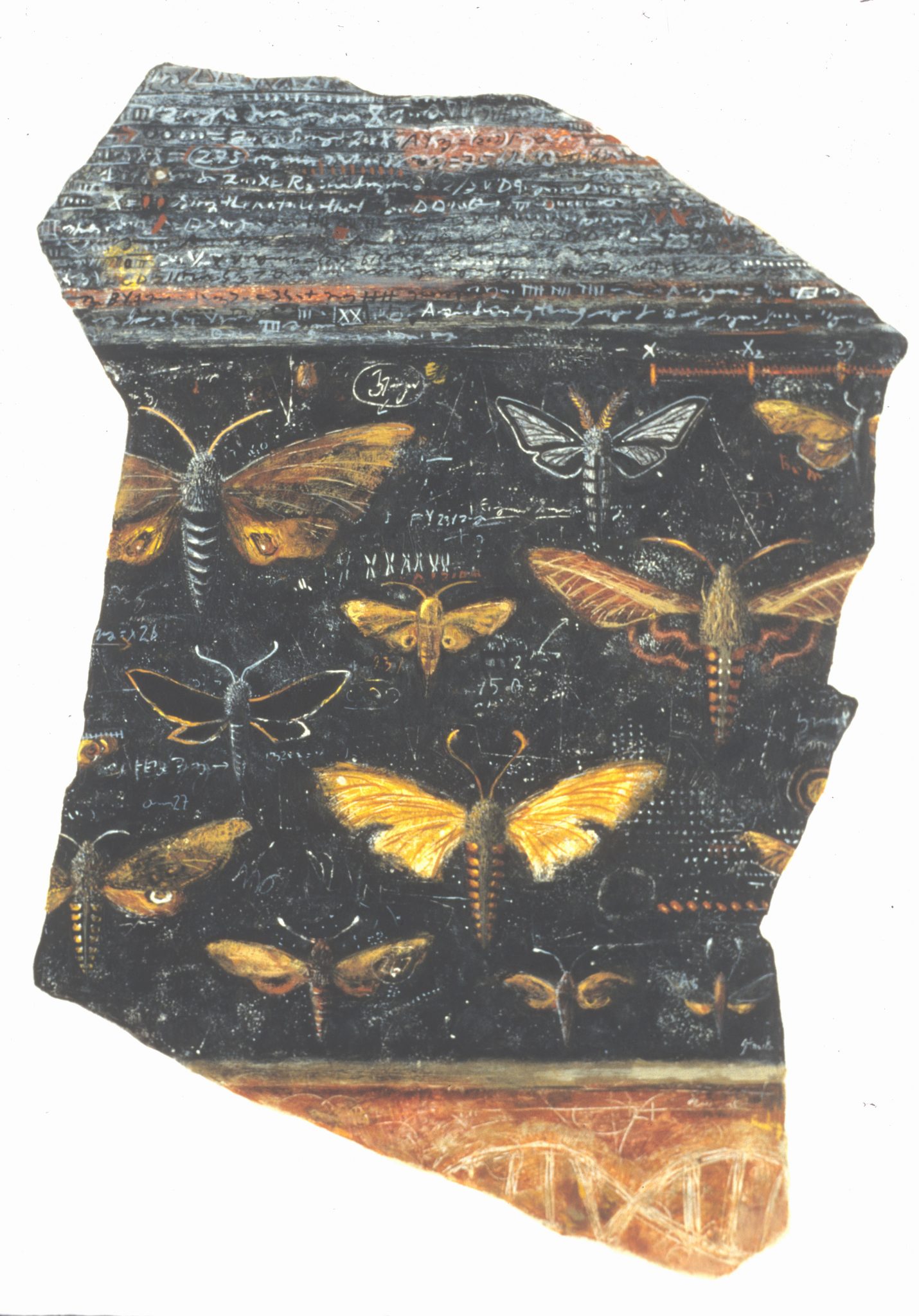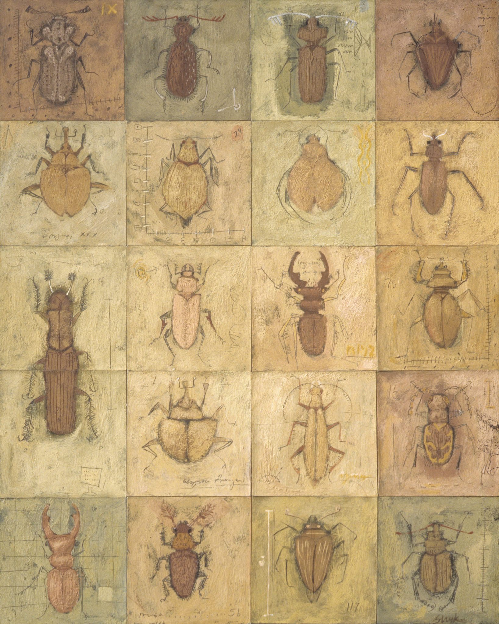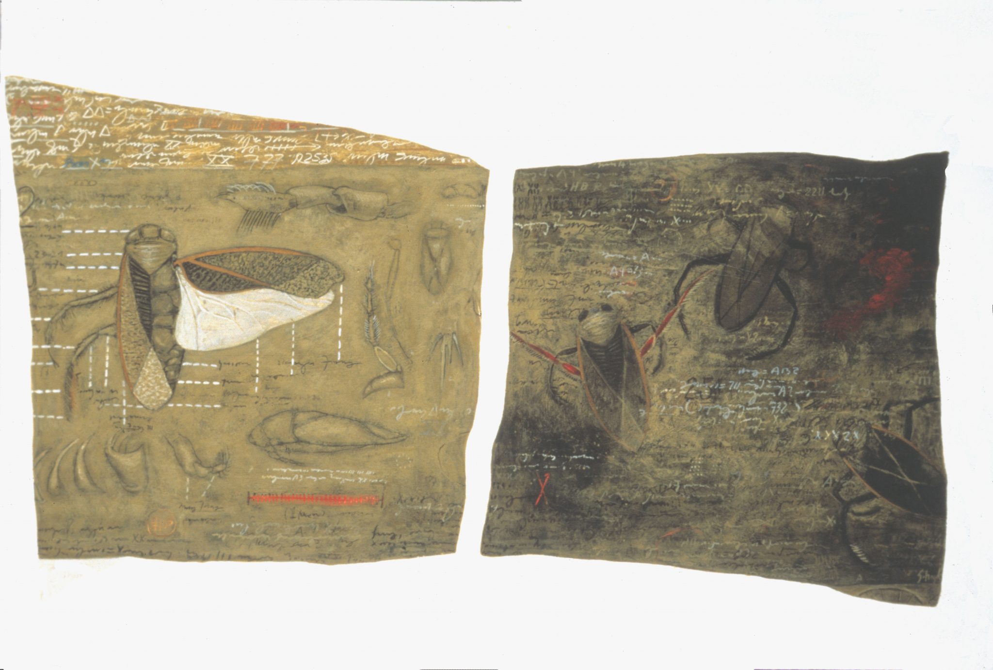 During these years I worked primarily in gouache on paper, exploring ideas about the natural world that are sometimes scientific, sometimes mythological. Often the images suggest archeological relics or fragments. Each of these paintings represents an entire series consisting of anywhere from 15 to 40 works. In 1997 I began developing my techniques with acrylic on wood panel, represented by the last 3 pieces.