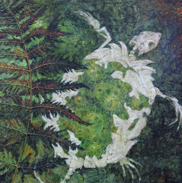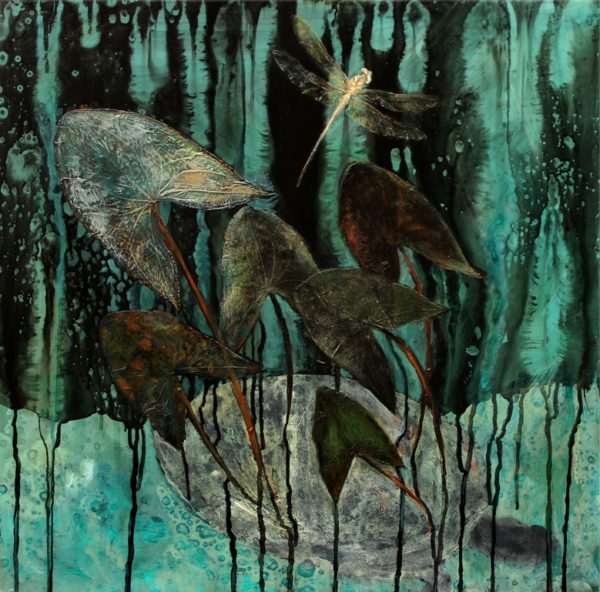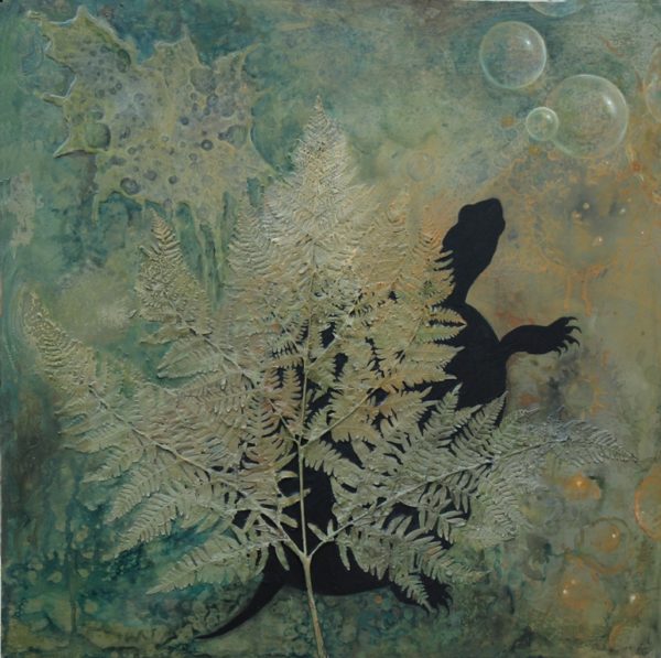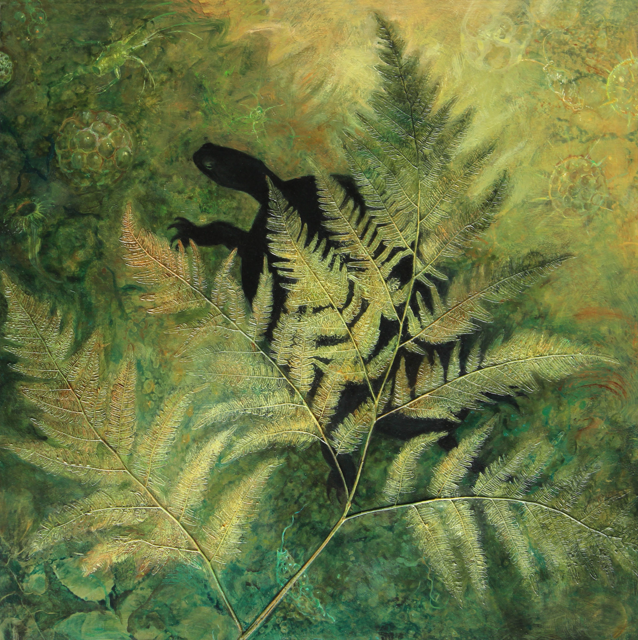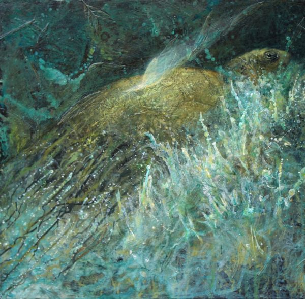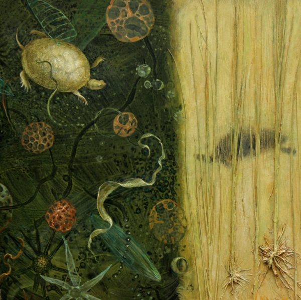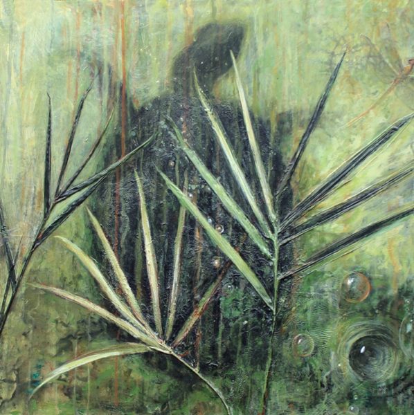 I’m standing on the boardwalk of Sugar Hollow wetland watching a dark shape swirl below the water. Soon, a snapping turtle’s little nostrils and bulging dim eyes break the surface, emerging from the prehistoric into the present. Nearby, a slider turtle basks on a log jutting from the water, its yellow-striped head and paddle-like back feet outstretched like a blissful sun-worshipper. Such sightings—and imagining a turtle’s world—are the focus of my new series of paintings, Coming Up for Air.