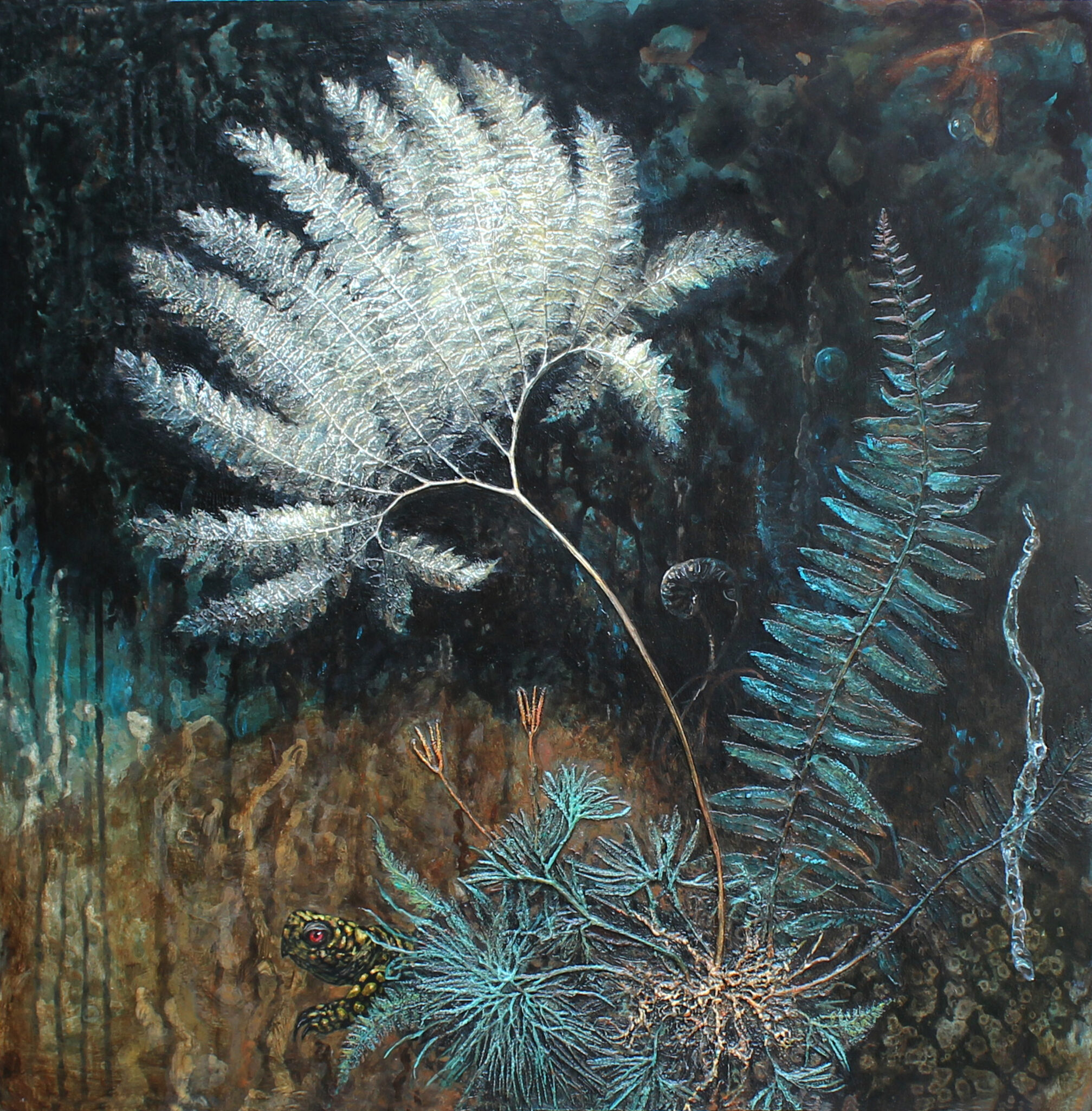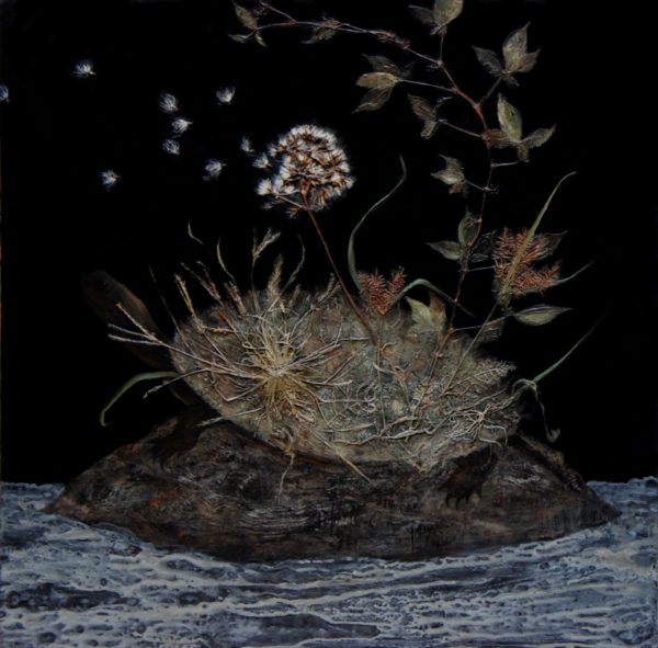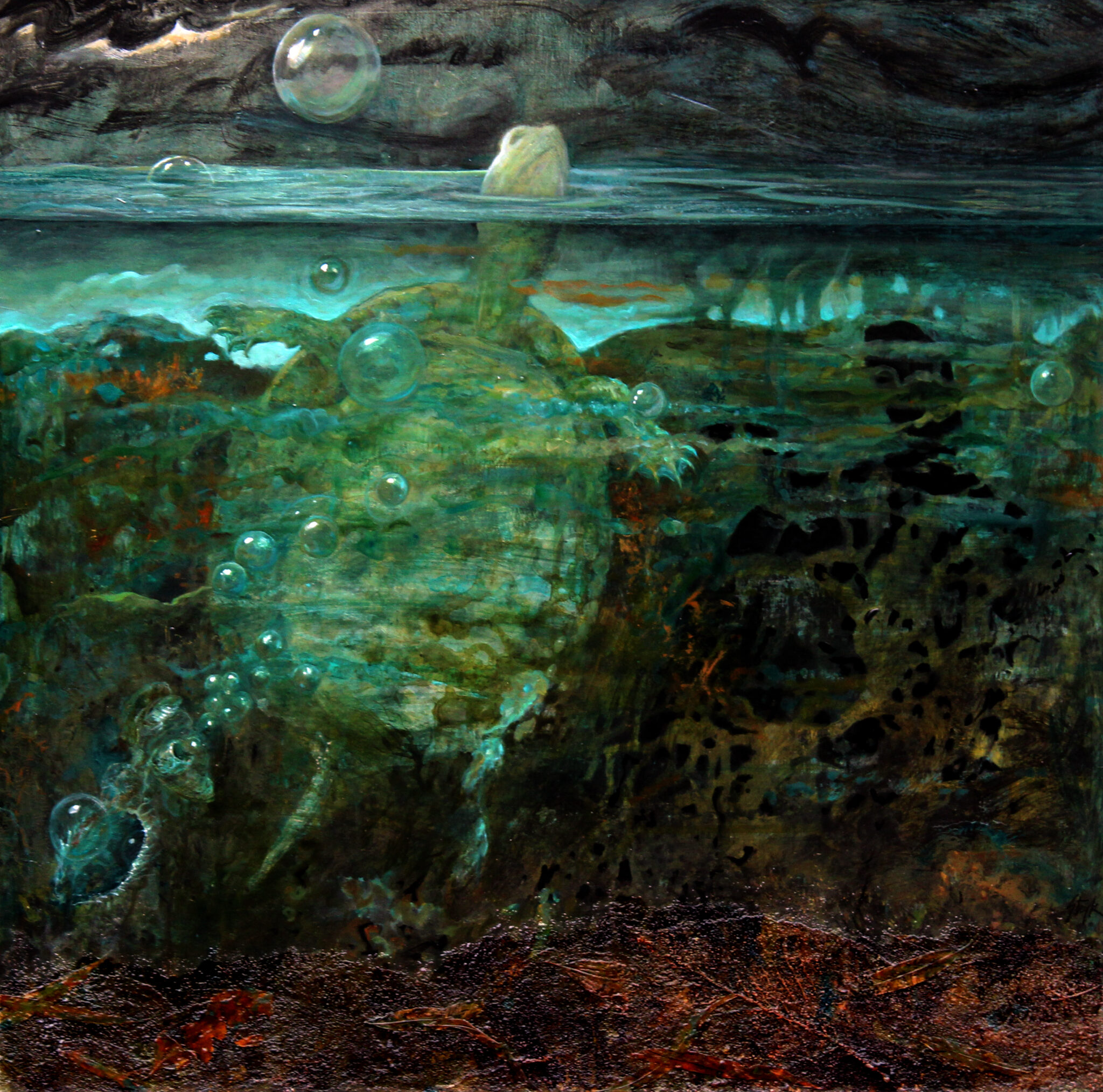 Yet these turtle images also tap into our own life experiences. What do we mean, say, when we "come up for air”? A need for a thought-pause or relief from stress? And in some paintings I explore turtle myths, such as the Japanese “minogame,” an ancient turtle with algae trailing from its shell said to represent longevity and wisdom; in my version, I pair a long-lived turtle with an ephemeral mayfly.